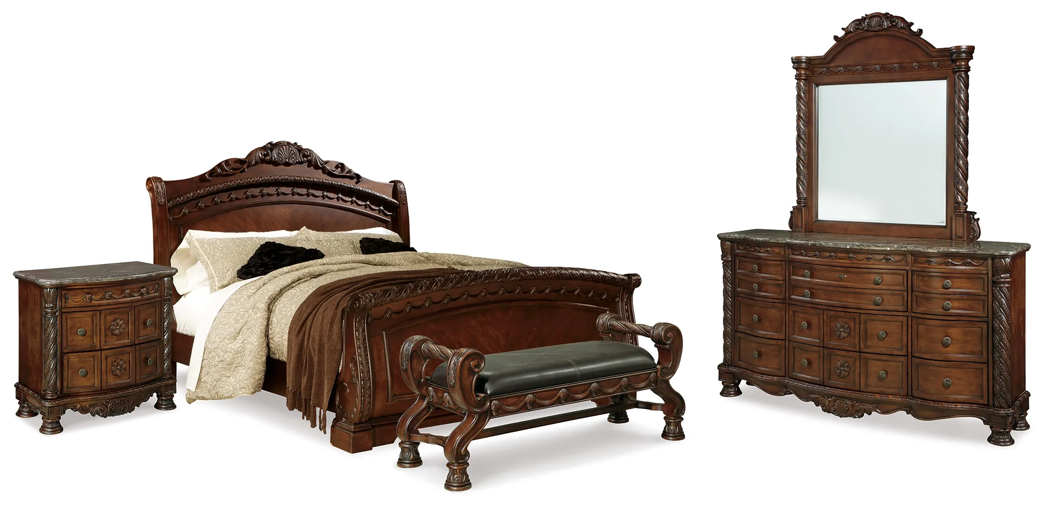 North Shore Queen Sleigh Bed, Dresser, Mirror, Nightstand and Bench
