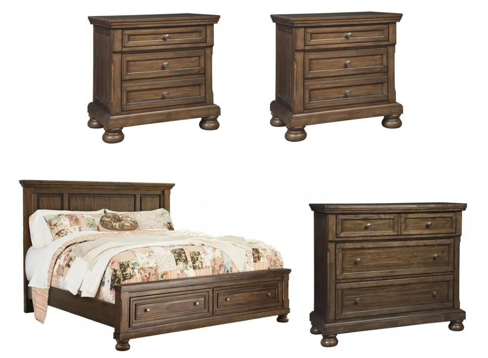 Flynnter 4 PC King Bedroom Set includes, king panel bed with storage, media chest, and 2 nightstands.