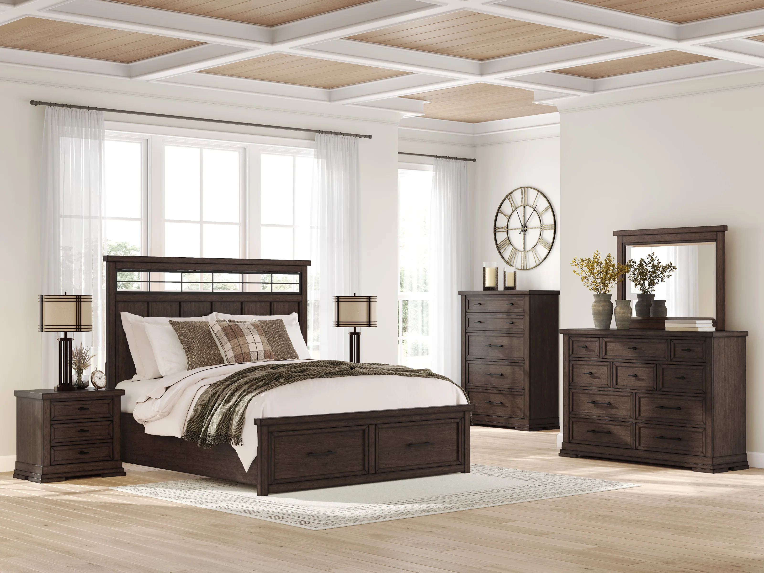 Style, simplicity and charm are hallmarks of this queen panel storage bed. Created with casual spaces in mind, it has the versatility to suit styles from craftsman to modern farmhouse. The rich brown finish aligns with your refined-meets-relaxed approach to everyday style. Short on storage space? Ultra-spacious under bed drawers keep extra clothes and linens neatly tucked away. And for a timeless touch, black metal fretwork on the headboard brings an inviting mixed-material feel to the overall look.