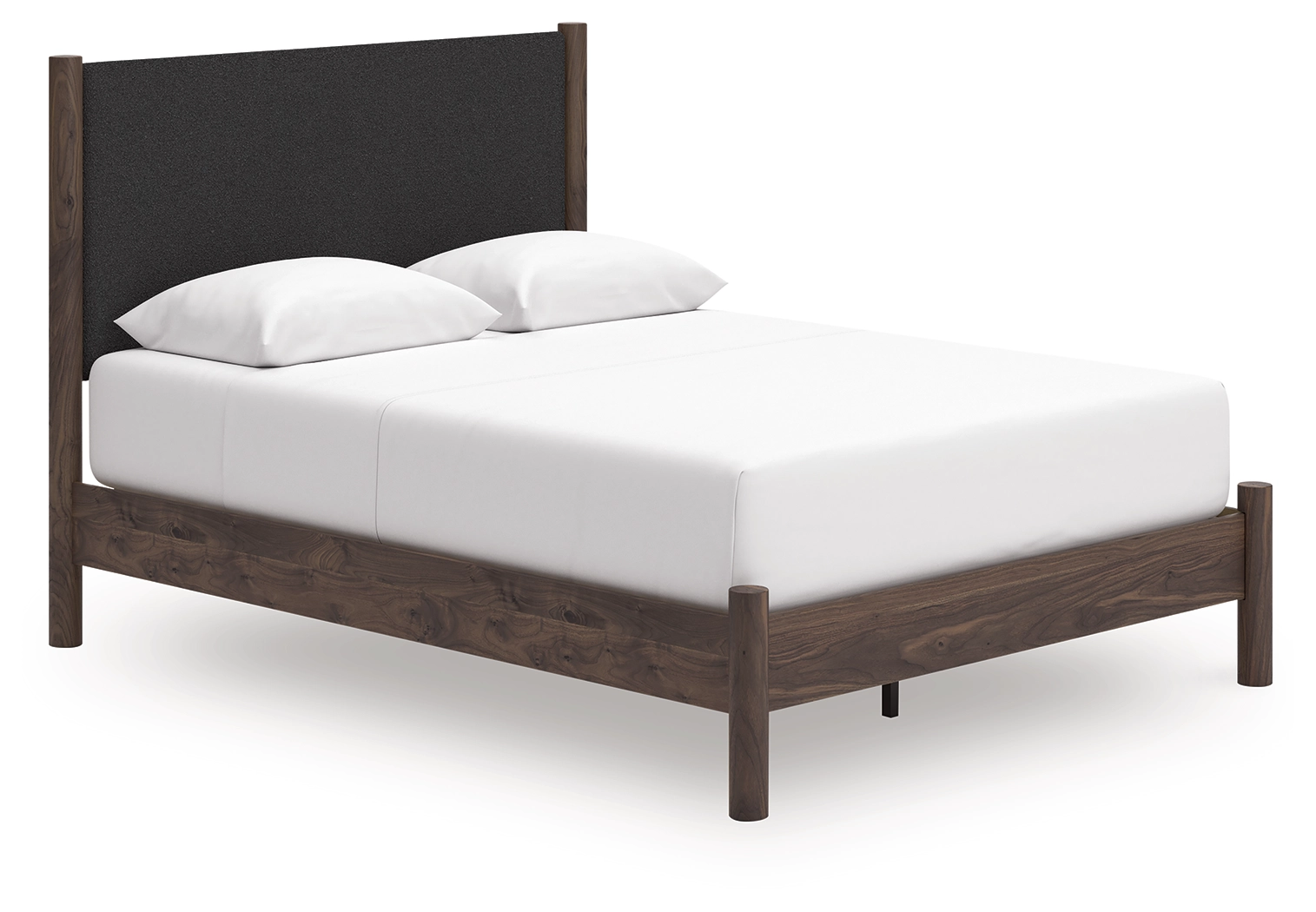 Includes upholstered panel headboard, platform footboard with rails and roll slats