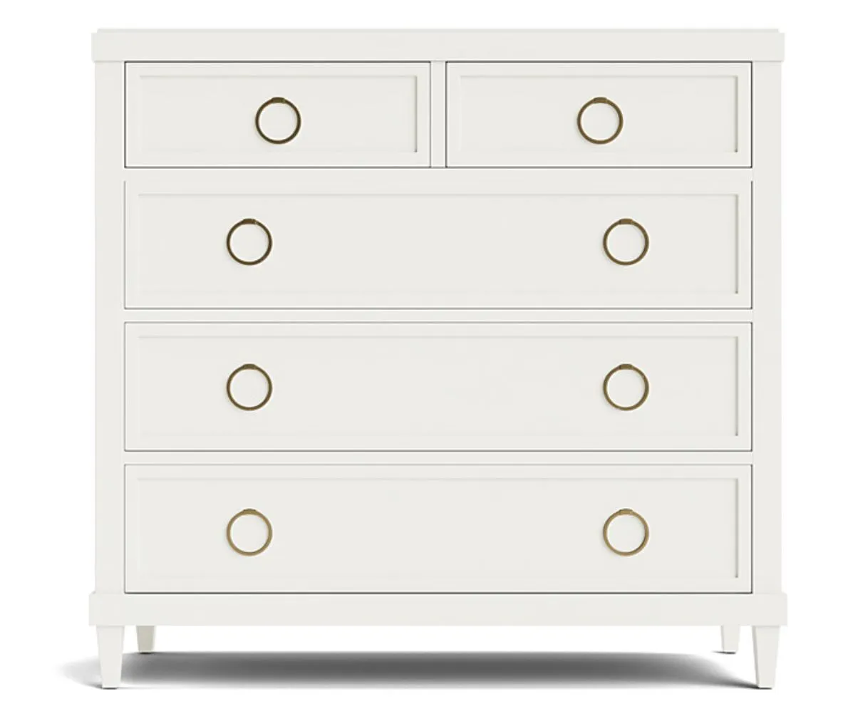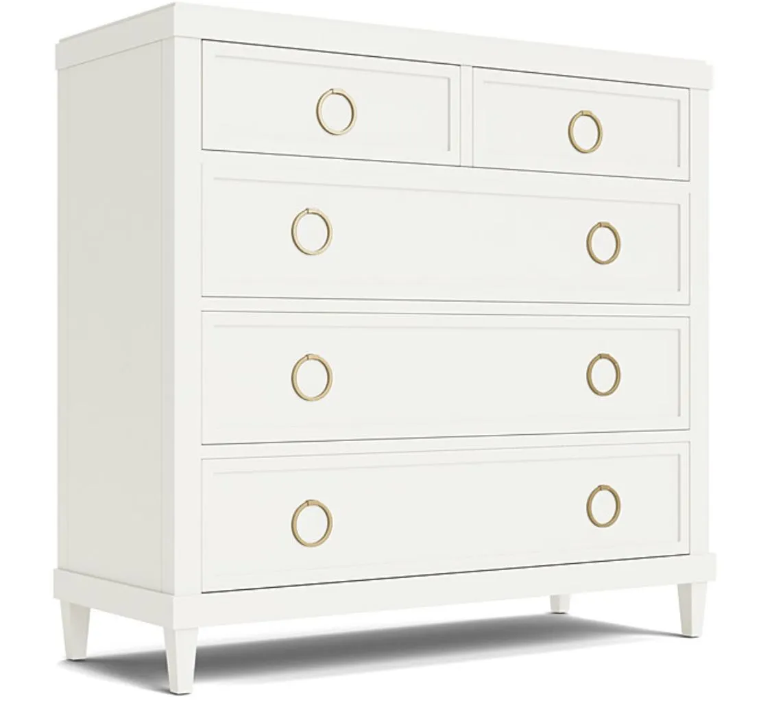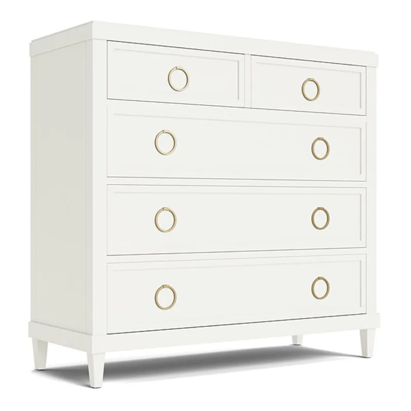 Scaled to be at home in any size bedroom, Bassett’s Ventura Colors Chest carries itself with architectural élan and an air of modern classicism. Rising 5 drawers high on tapered legs and wearing a crown of molding, you can store your clothing or bed linens with style in a modest footprint. Choose your preferred color, applied in a semi-opaque finish designed to enhance the natural markings of the knotty elm veneer that covers poplar solids. Another customizing option is a choice of three metal finishes – Satin Brass, Satin Nickel, and Gunmetal – for the sophisticated ring drawer pulls. The bottom drawer is cedar-lined. The entire Ventura Collection is a design delight, offering a common thread through a panoply of textures and finishes that allows you to create a room personalized for your style and needs.