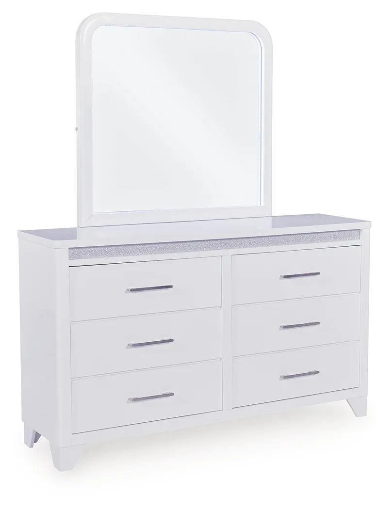 This dresser with mirror is a showstopper, bringing a touch of modern glamour to your sanctuary. A sleek white finish and inset glitter accents create a luxurious feel, while six spacious drawers provide ample storage for your wardrobe. The mirror’s built-in LED lighting adds a soft glow, making it even easier to get ready in the morning or wind down at night. It’s a simply stunning way to achieve the bedroom of your dreams.