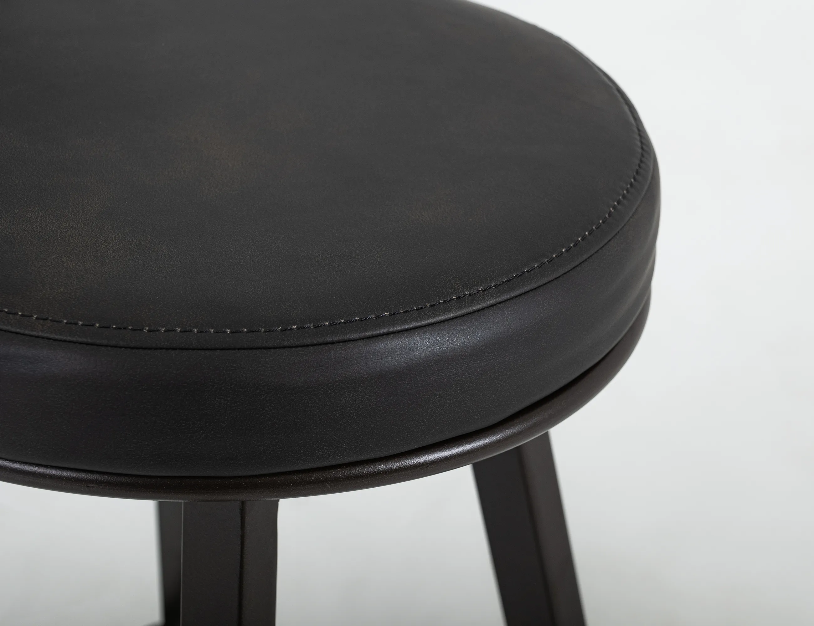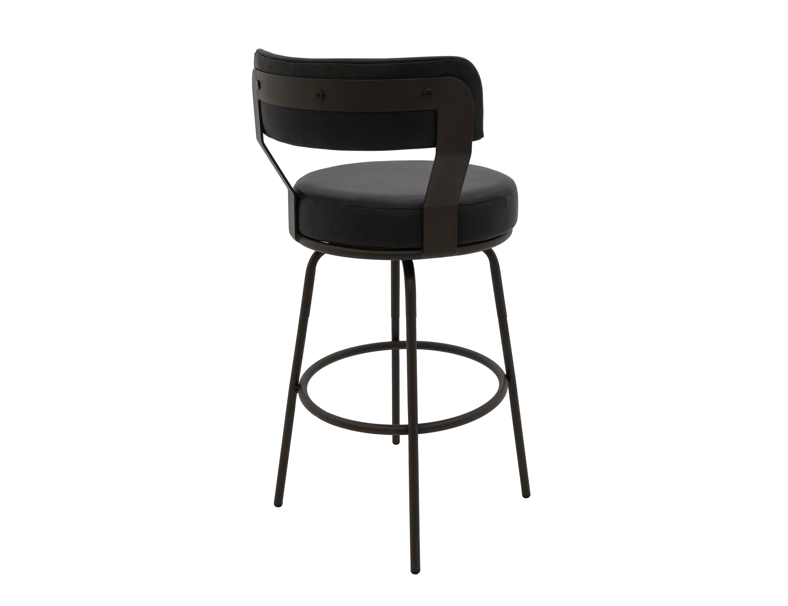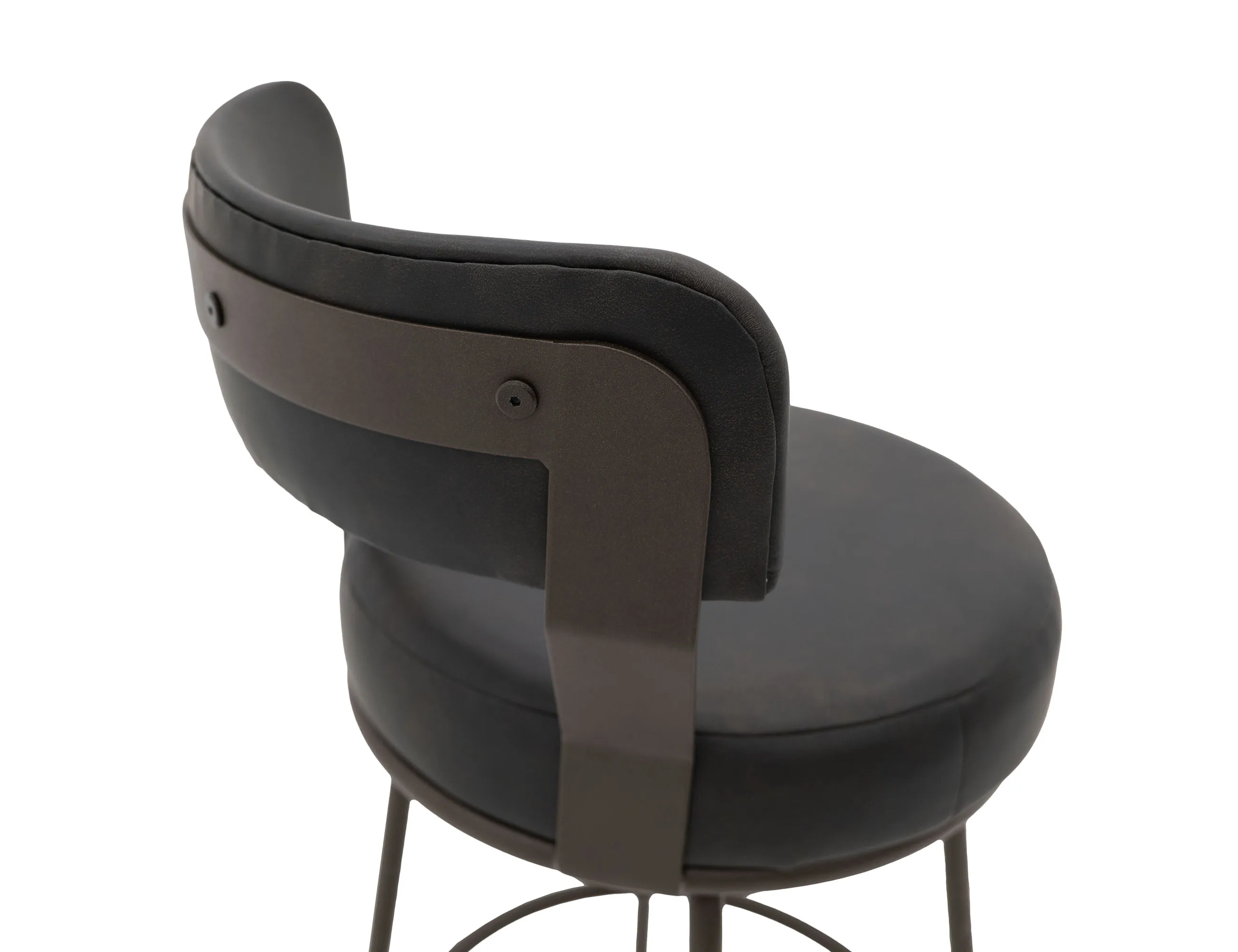 - Comfortable round cushioned seat is upholstered in black faux leather with brown highlights.