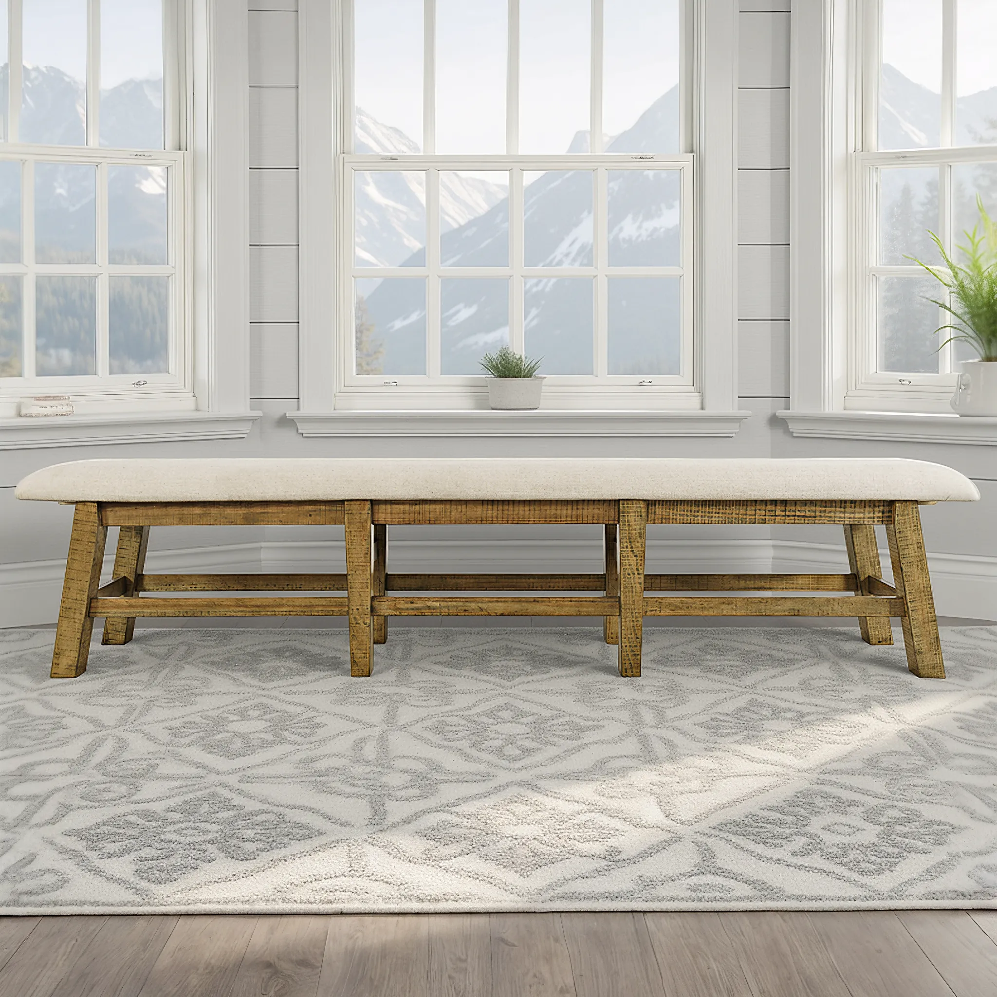 The Telluride Collection is the essence of rustic country style with distressed solid pine handcrafted into spectacular furniture perfect for any room in your home. Each piece is unique with subtle distressing that brings out the full grain beauty of the natural wood. This eye-catching dining bench is ready to be part of your home. Soft padding covers a frame of solid distressed pine, with a neutral color palette that looks amazing paired with our Telluride dining collection, or to freshen up an existing dining room or entryway. Measuring 85 inches wide, our versatile bench is a must for your everyday entertaining or dining needs.