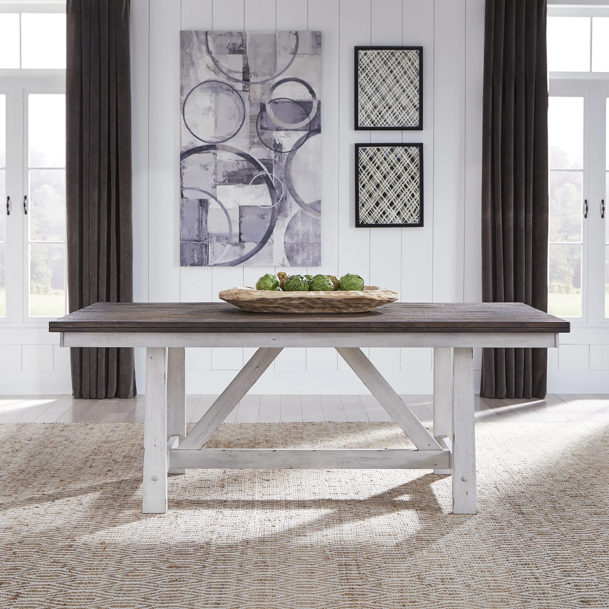 Sitting pretty with the Farmhouse seven-piece trestle table set. Crafted of rubberwood solids and veneers, this kit includes the fixed-top trestle table and six Windsor back side chairs. The trestle table features a timeless heavy distressing with a two-tone white and wood-tone finish with a planked top. The Windsor chairs, known for their comfort, feature nylon chair glides to protect your flooring and the same two-tone finish as the table.