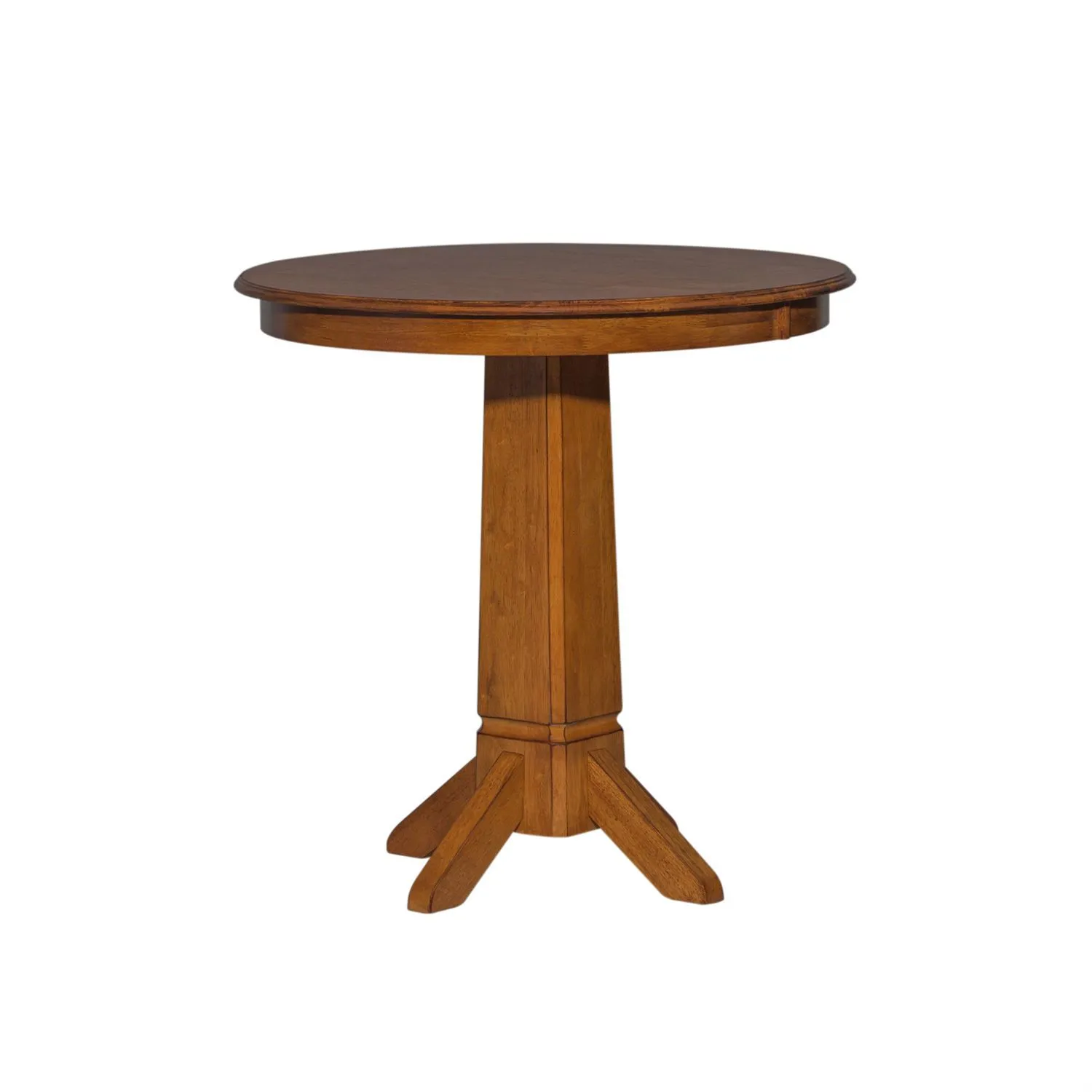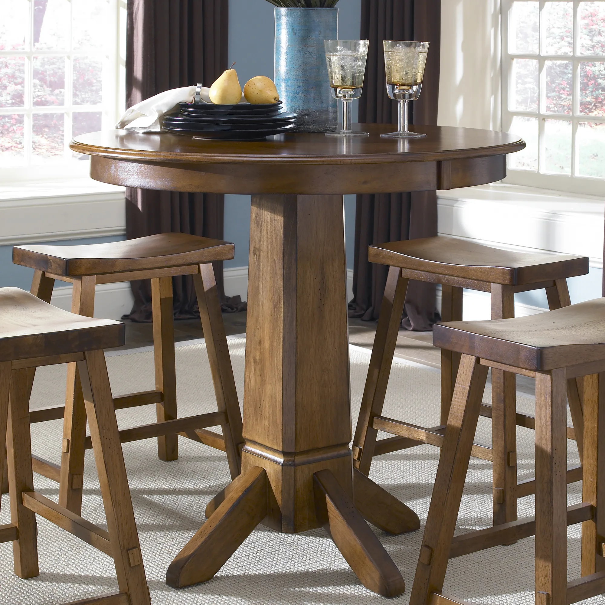 Dining featuring warm tobacco finish in multiple sizes to fit every need. Butcher block top revealed under the impeccable finish surrounded by double header wood pencil post chairs. Choose from small pedestal, casual drop leaf, or rectangular butterfly leaf tables to suit your unique needs.