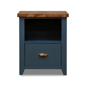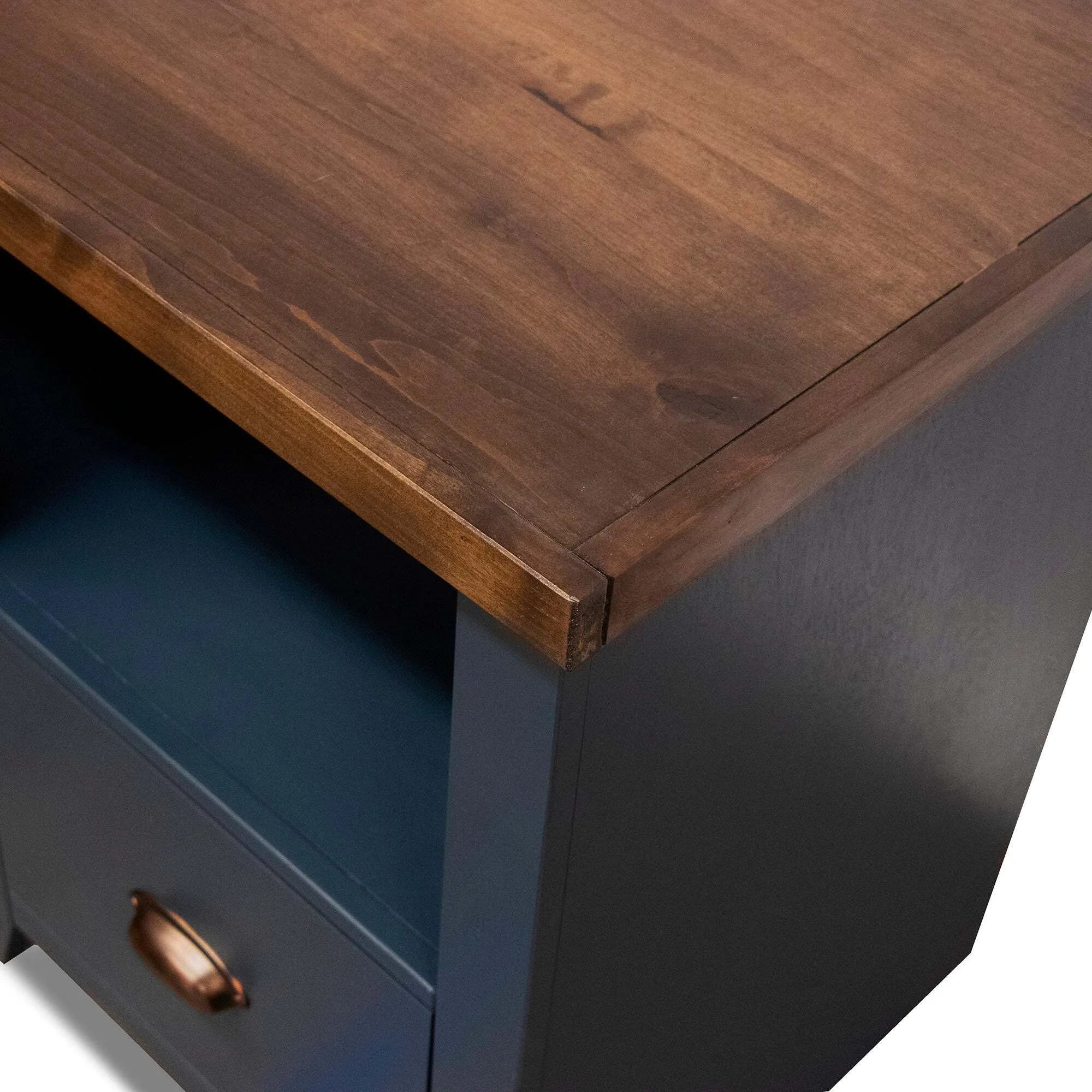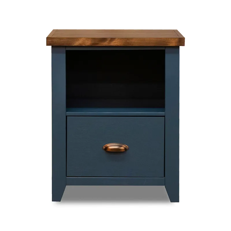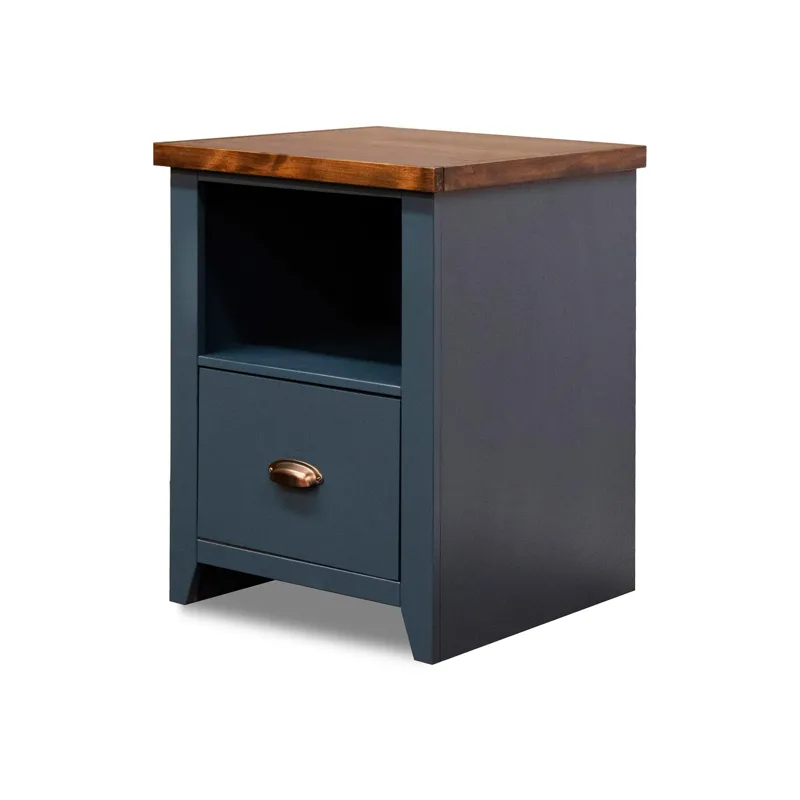 The Nantucket One Drawer File Cabinet combines the charm of coastal cottage aesthetics with the simplicity of modern farmhouse design. Finished in an eye-catching Blue Denim and Whiskey, this piece features oil-rubbed bronze hardware, a storage drawer, and a shelf, complementing any home office or study area. It pairs perfectly with the matching writing desk for a cohesive look.
