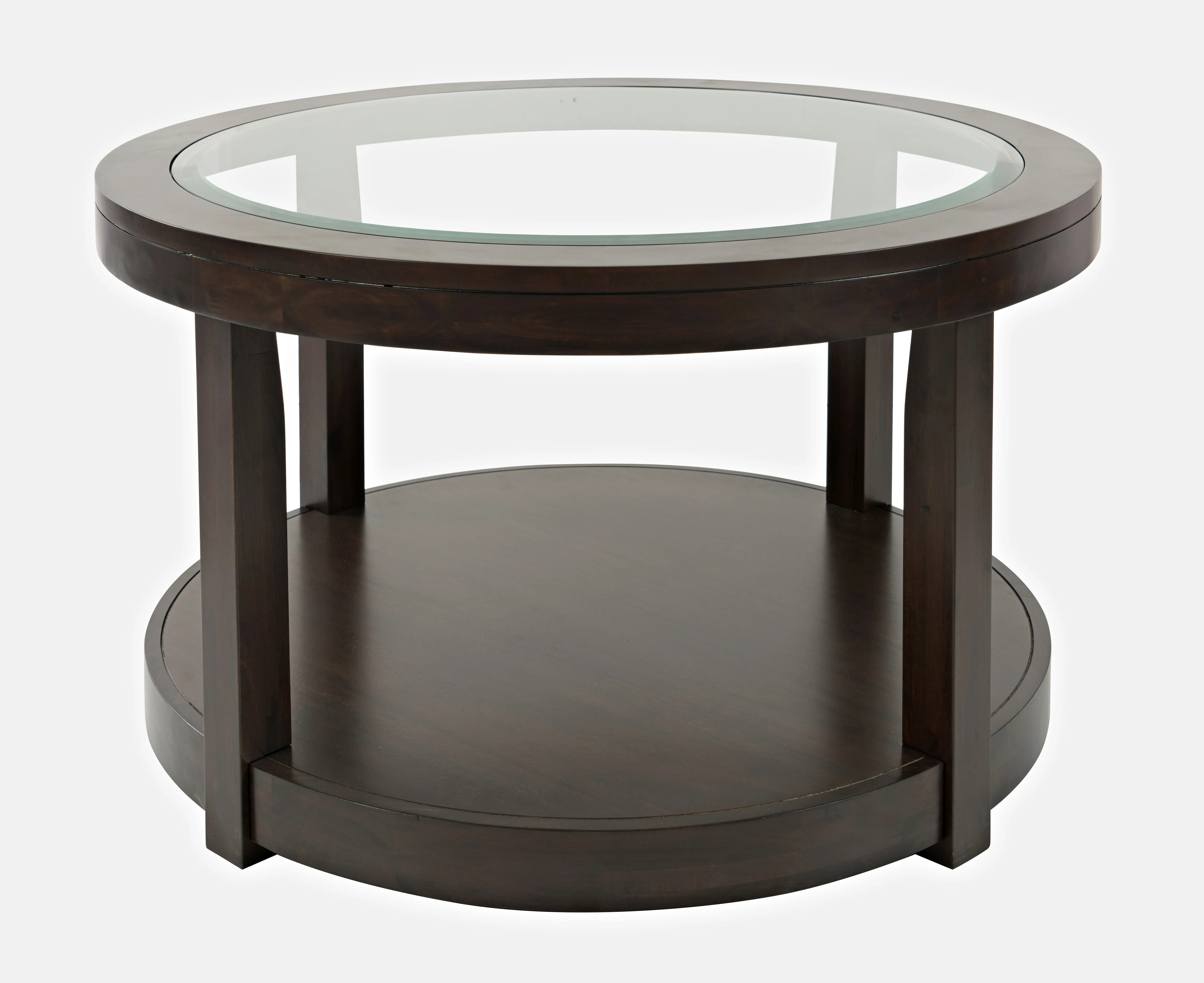 Contemporary style with a solid tempered glass inlay, this Urban Icon Round Coffee Table features three unique color options and modern beveled edges. One full-length storage shelf is included, and the optional caster wheels make moving easy. Available In White, Black, and Merlot finishes.