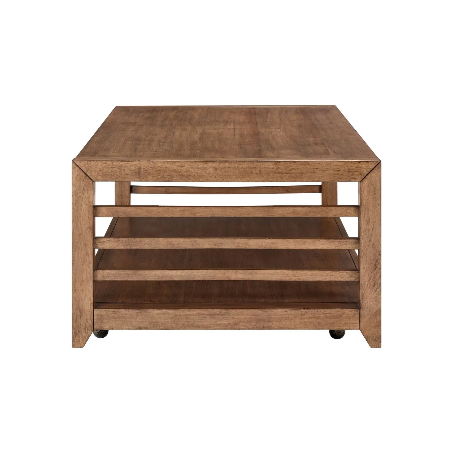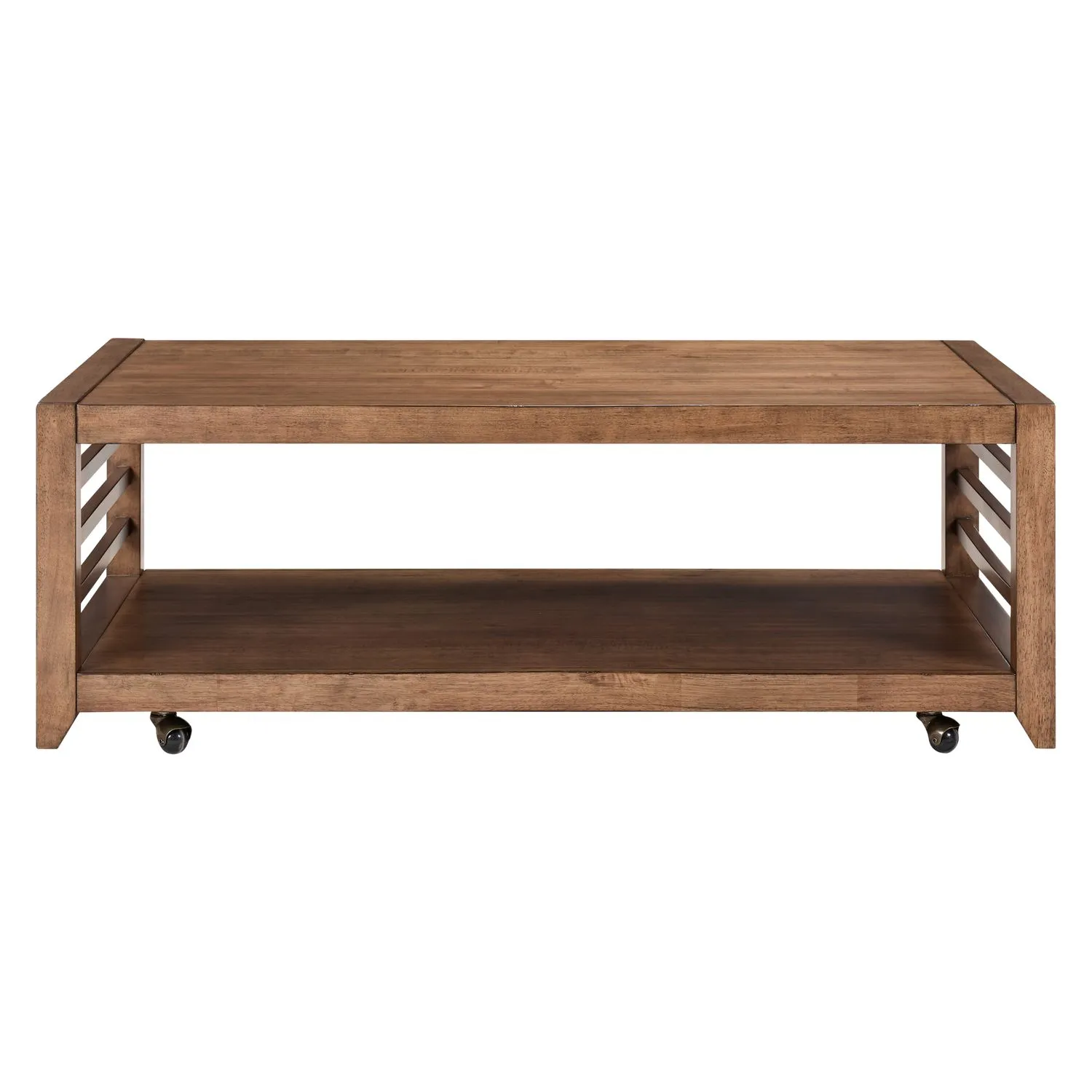 Bring timeless charm and warmth to your living space with the Shaker Lakes Cocktail Table. Crafted of Poplar solids with Pin Knotty Maple veneers in a rich Harvest Brown finish, this table showcases classic picture frame styling and block legs that flow into angled tapered feet for a graceful touch. Open side slats add to the table’s traditional Shaker-inspired look, while a spacious bottom shelf offers the perfect spot for display or storage. Hidden casters provide easy mobility, blending practicality with enduring style.