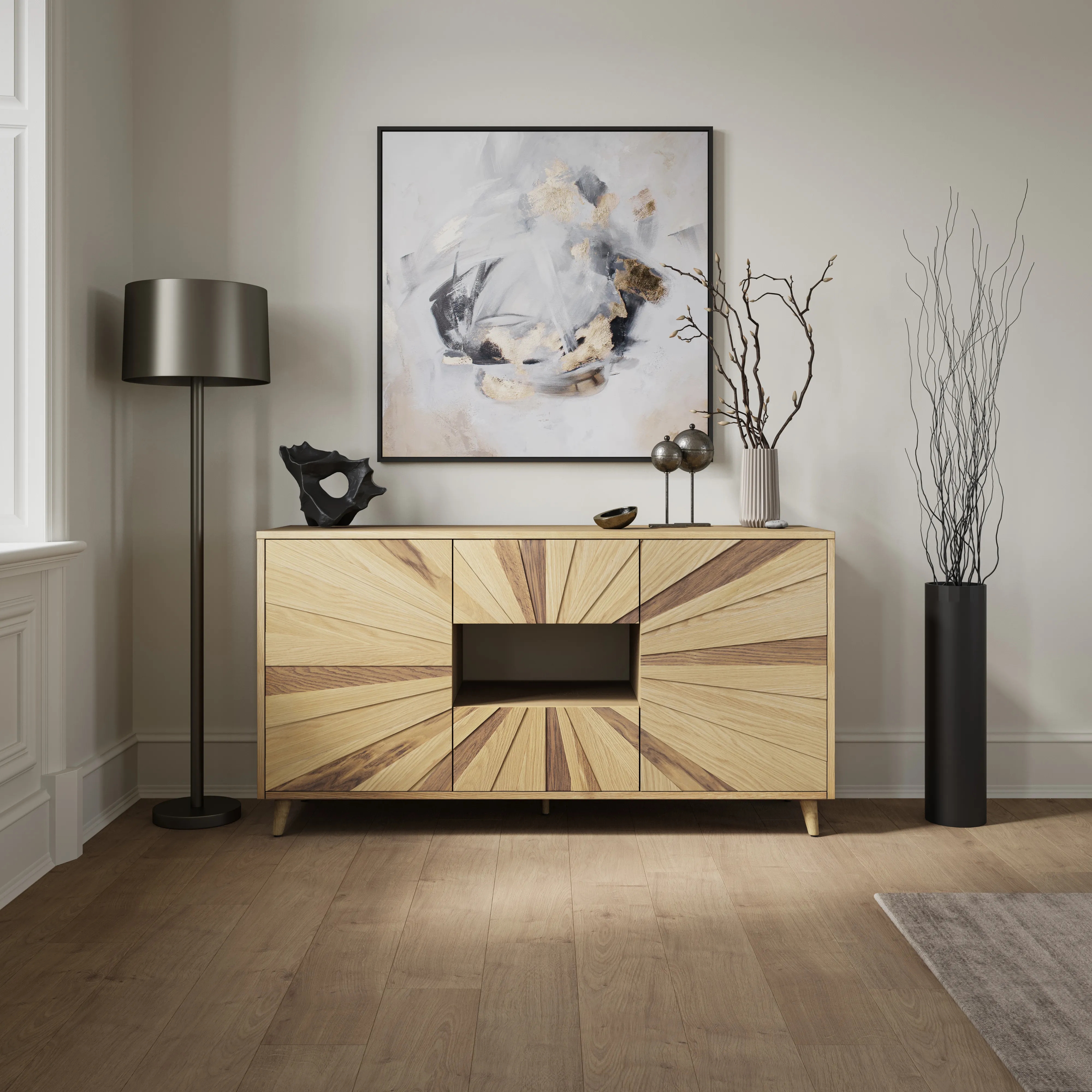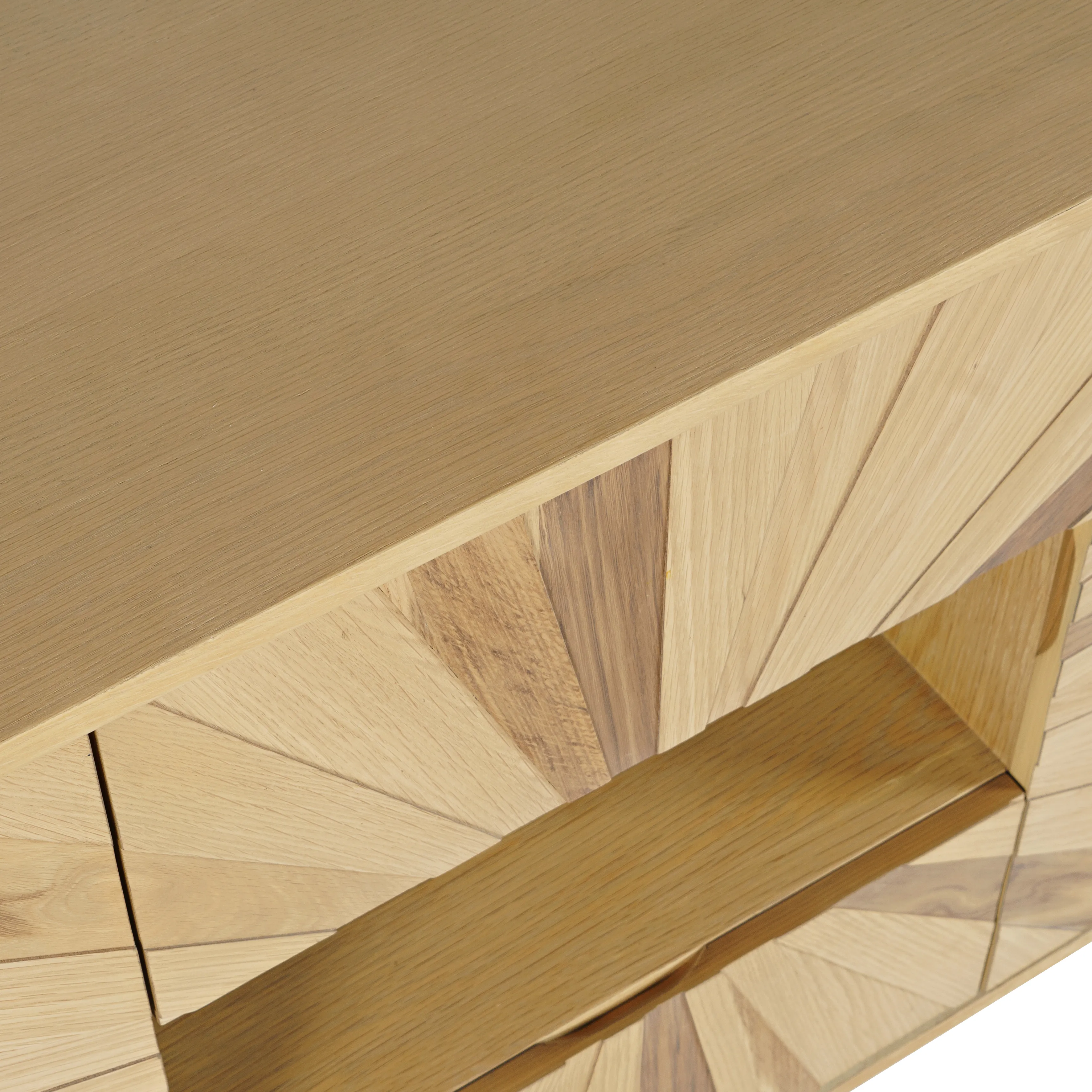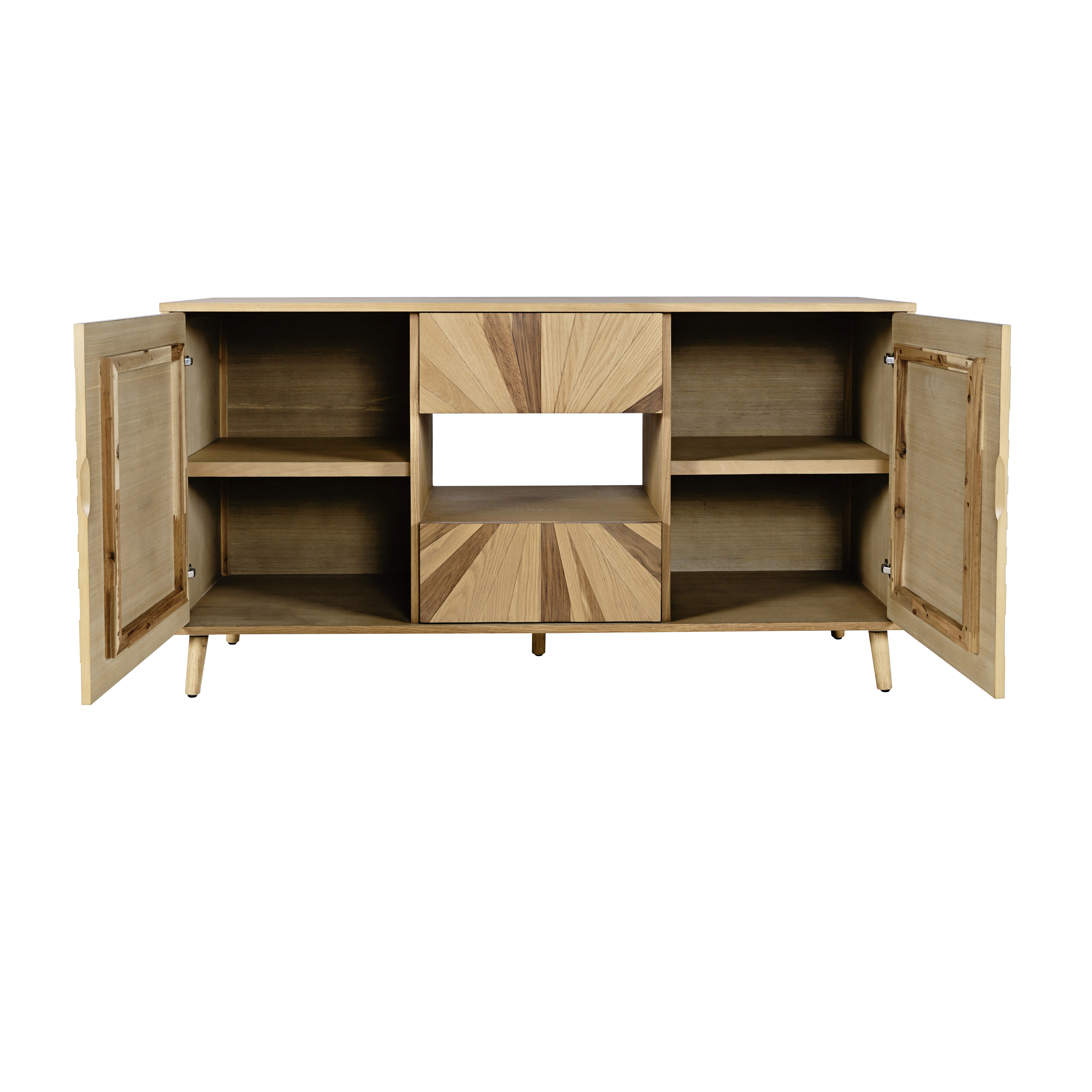 • -Two Doors and Two Drawers -Unique Modern Sunburst Design -Open Storage In Center Cabinet for Electronics -Easy assembly - no tools required - - -