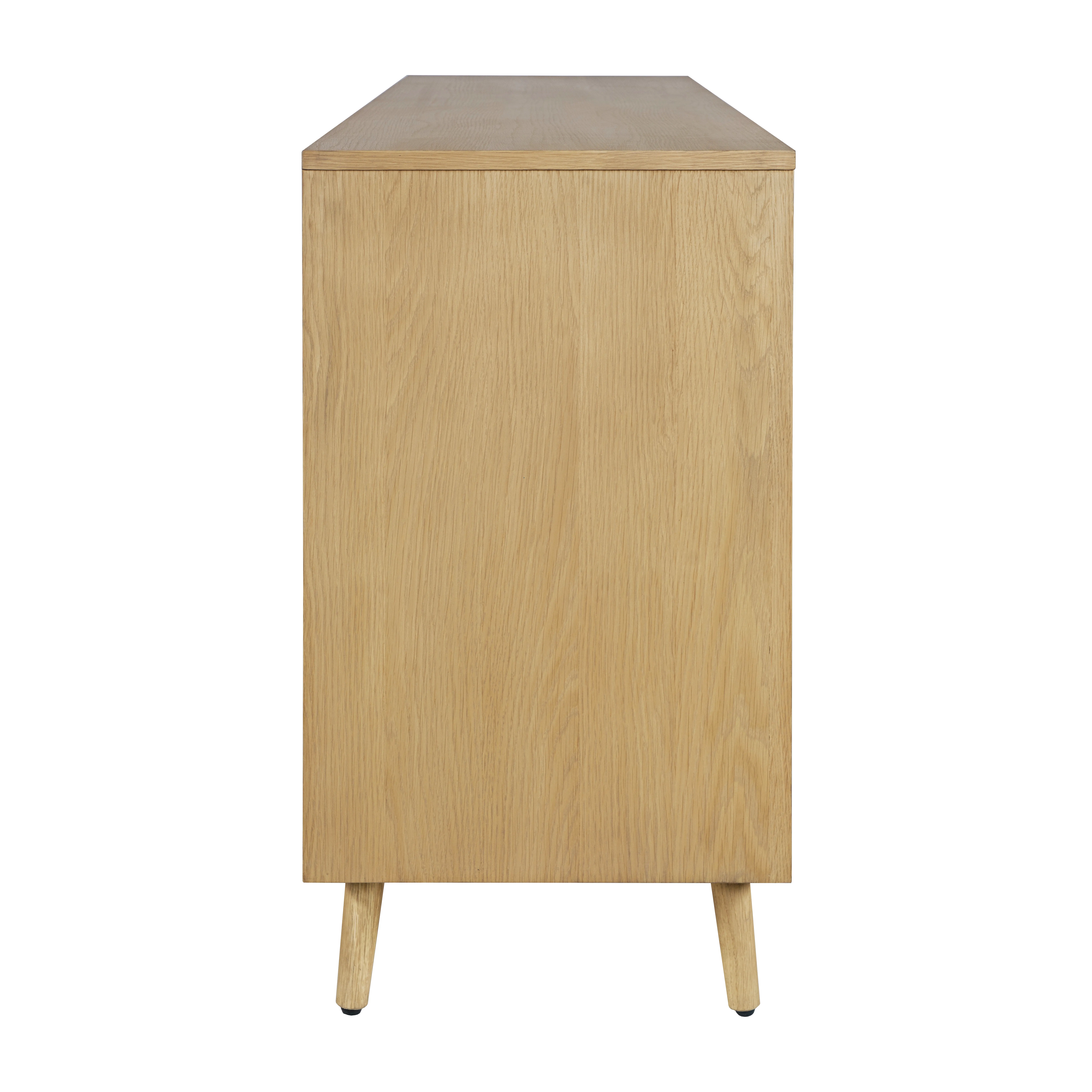 Elevate your entertainment space with the Reece Mid-Century Modern Starburst TV Stand Console, where timeless design meets practical functionality. Crafted with a combination of solid acacia wood and veneer, this piece features a stunning starburst pattern across its facade, making it a standout centerpiece for any room. Available in three sophisticated finishes and sizes, the Reece offers the perfect balance of style and versatility to suit your home decor. Thoughtfully designed, the cabinet includes two spacious storage compartments with adjustable shelves, two smooth-glide drawers, and a unique open cutout in the center - ideal for showcasing electronics, video game systems, or decor accents. The solid acacia construction provides a substantial feel that's built to handle the demands of everyday use. Rear cable cutouts keep cords organized and out of sight, ensuring a clean, clutter-free look. Best of all, assembly is quick and easy no tools are required; simply attach the legs, and it's ready to use. Whether as a TV stand, media console, or storage cabinet, the Reece transforms your living space with its striking design, practical features, and timeless appeal.