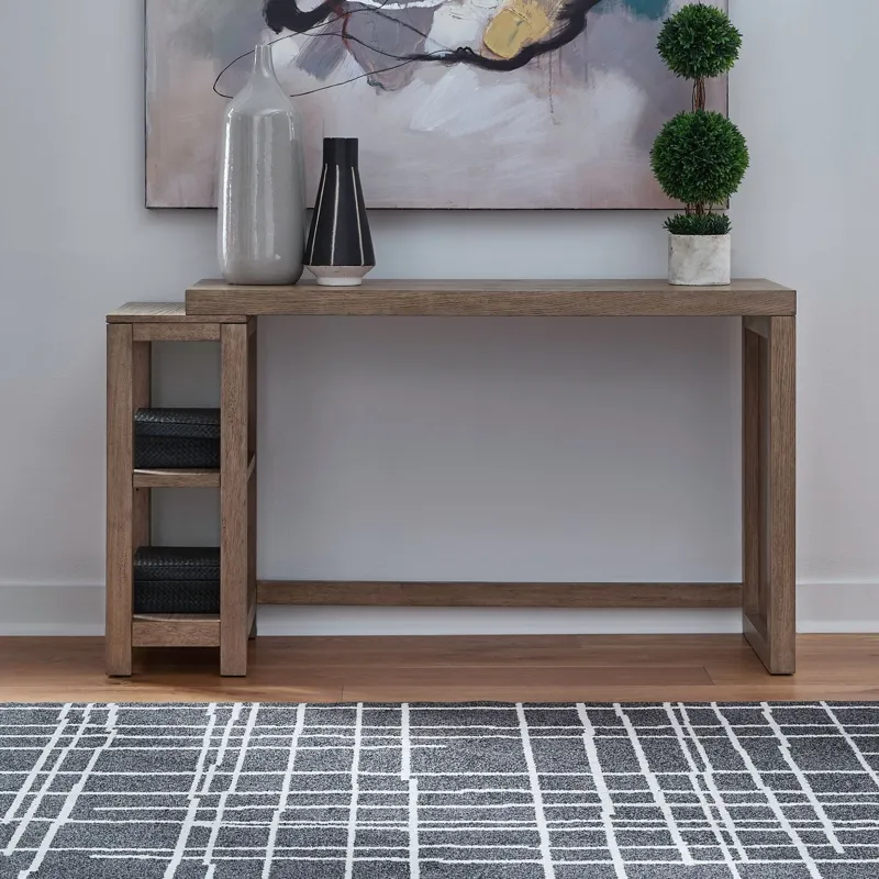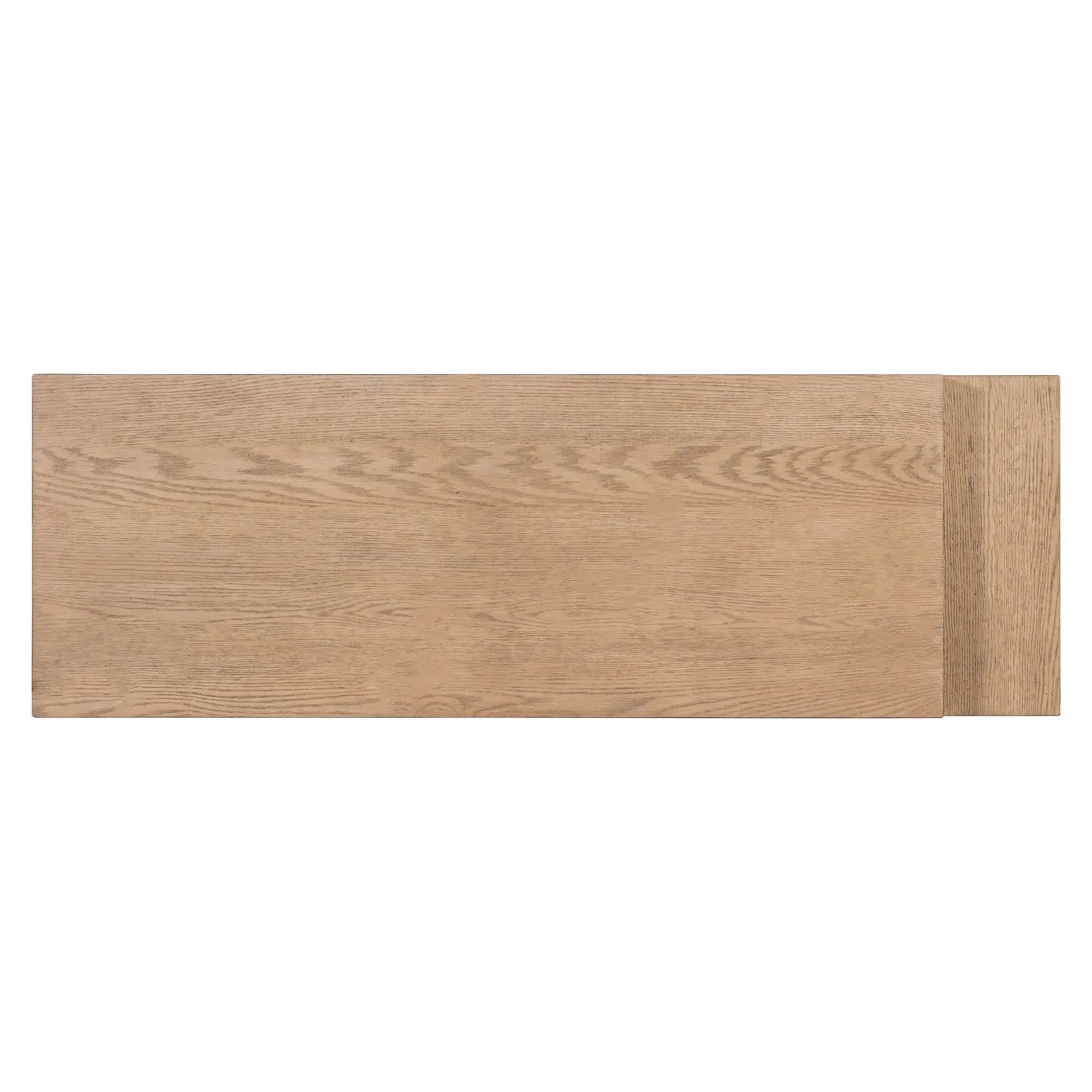 The Corso Console Table combines sleek industrial design with versatile functionality, making it an ideal piece for modern living spaces. Crafted of Rubberwood solids and Split Heart White Oak veneers in a stylish Natural, this table features a distinctive layered top that adds depth and texture. One end boasts an open bookshelf storage area with an adjustable wood shelf, providing flexible space for books or décor. Perfectly sized to fit behind a sofa, this console bar offers room to comfortably seat two, blending style and practicality with ease.