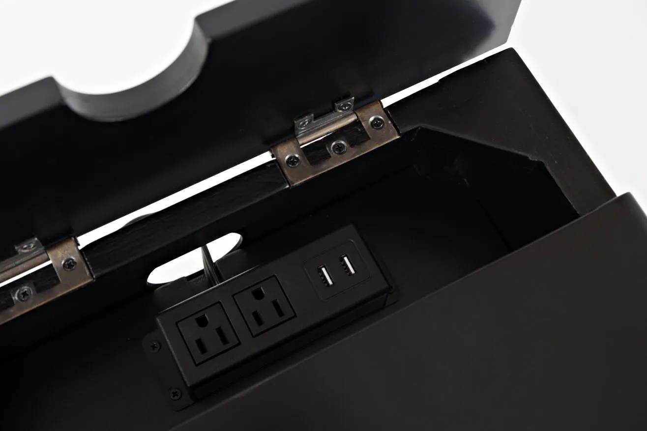 - -Power Unit has two built-in outlets and two USB ports hidden inside table top -Drawer Dimensions: 9.75"W x 11.25"D x 2.25"H -Cabinet Opening: 12"W x 15.5"H -Area behind door: 12"W x 19.5"D x 15.5"H -Fully Assembled - Arrives Ready to Use -For residential use only -