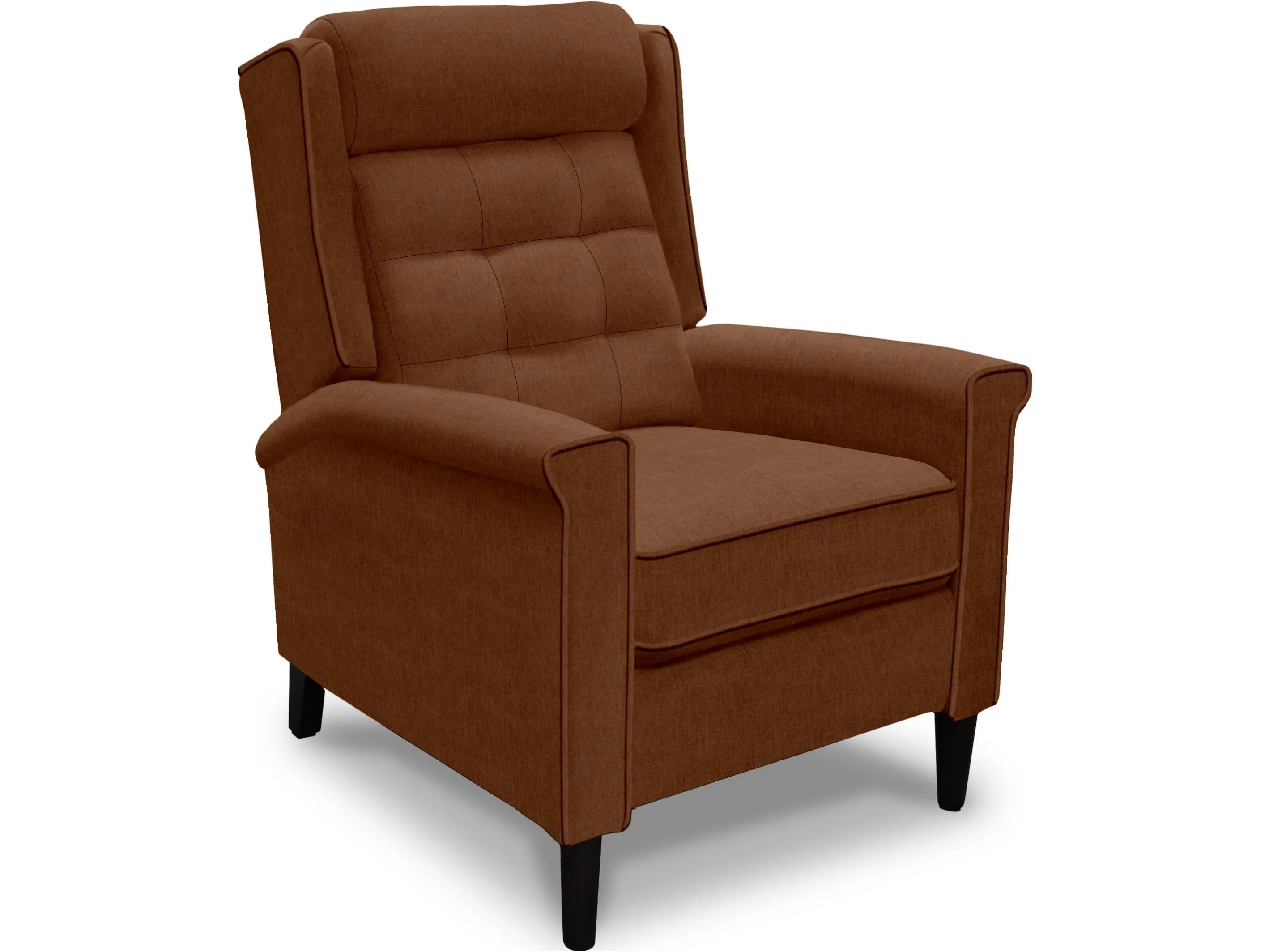 The Holland chair boasts an understated vintage style. This push back recliner features a key arm, cone shaped leg, and chic tufted back. Available in both fabric and leather.