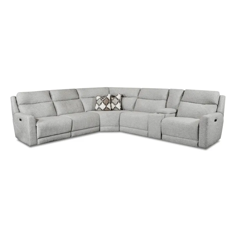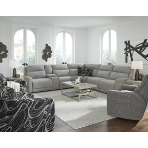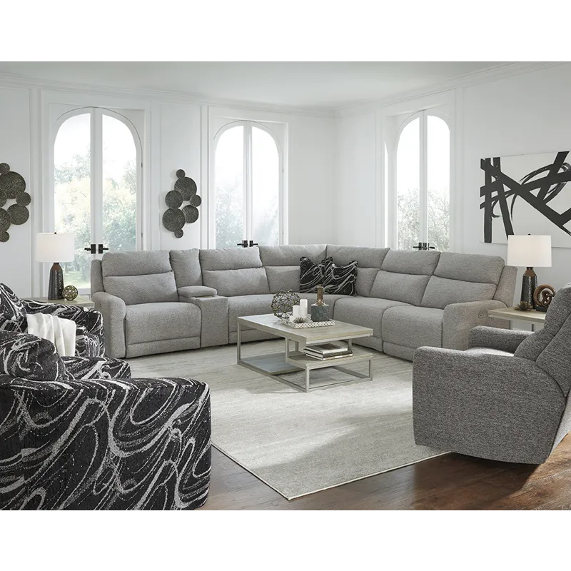 Social Club 7 PC Sectional includes Power Headrest LAF Single Seat Recliner, Power Headrest RAF Single Seat Recliner, Free Standing Console w/ Hidden Cupholders & Wireless Charging, Armless Chair, & Power Armless Recliner.