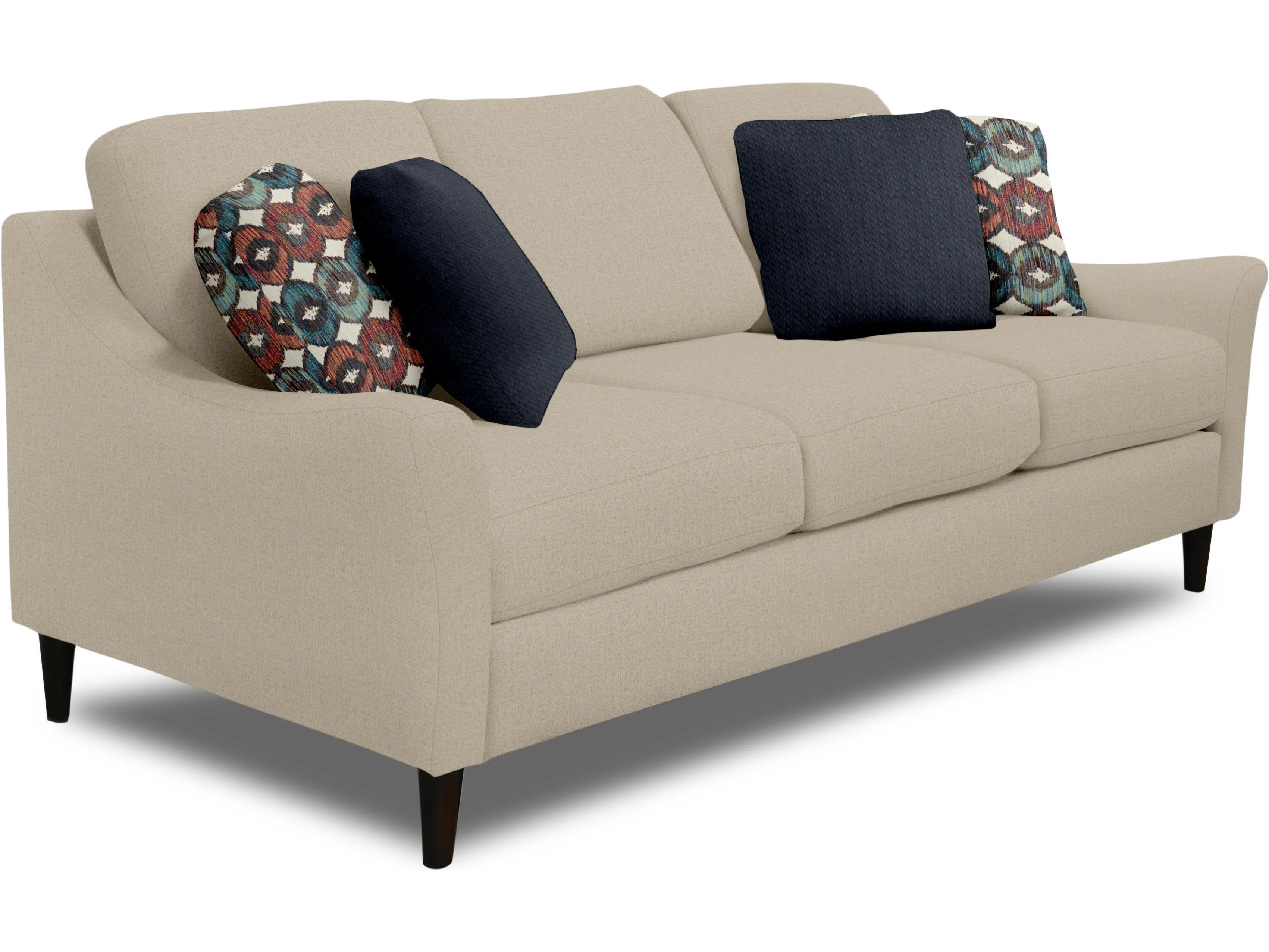 With its shapely silhouette, the Kinley collection makes quite the statement. Its sinuous flared arm and cone shape leg give a nod to mid-century styling. Choose from our multitude of fabrics and leathers to truly personalize this style. Available as a sofa, loveseat, chair, ottoman, and multiple sectional configurations.