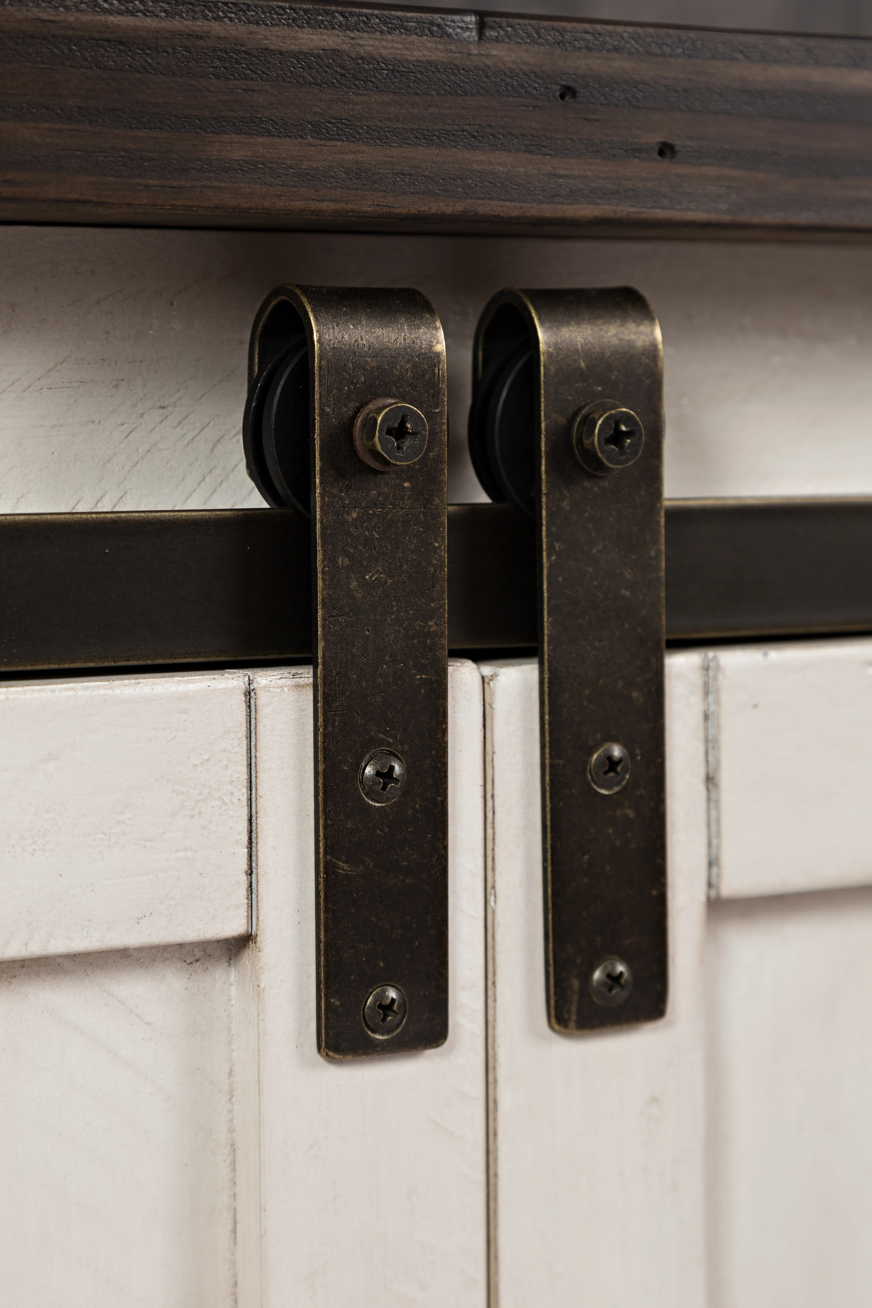 - -Base Console: Adjustable shelf behind sliding barn doors -Base Console: Shelf Dimensions: 28"W x 15"D -Base Console: Drawer Dimensions: 14"W x 13.5"D x 5.5"D -Base Console: Wood drawer glides -Base Console: Wire management -Hutch: Distance from base console to first shelf: 18.5" -Hutch First Shelf Dimensions: 64.5"W x 11.5"D x 10"H