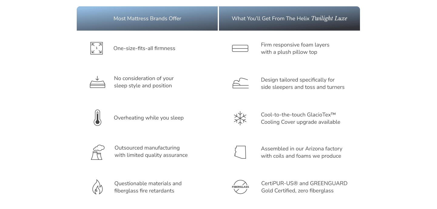 Helix Luxe is our premium line of mattresses. These upgraded mattresses take your sleep to a whole new level and are CertiPUR-US® certified, meaning they’re guaranteed to have no harmful chemicals. In addition to our signature feel and support options to match your sleep needs, we’ve added a few enhanced features and options.